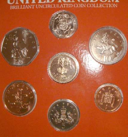 1983 Mint Set (Uncirculated) £1 Royal Coat of Arms for Great Britain 1st year of issue 50p,20p,10p,5p,2p,1p,½p. In official issue foldout flat pack (Blister Pack) |