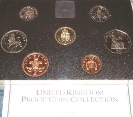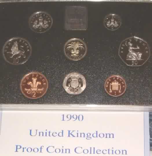 | 1990 Proof Set. (Currency) £1 Welsh Leek,50p,20p,10p,5p Large Type last year of issue & 5p New small type first year of issue,2p,1p.Deluxe issue Red leatherette case & COA |