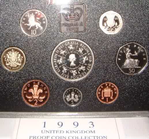 | 1993 Proof Set. (Currency) £5 40th Anniversary of the Coronation of Queen Elizabeth II, £1 Royal Arms of England, 50p,20p,10p,5p,2p,1p. Blue case of issue with COA |