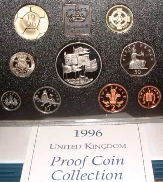 | 1996 Proof Set (Currency) £5 Queen Elizabeth II 70th Birday,£2 European Football Championship,£1 Celtic Cross Northern Ireland,50p,20p,10p,5p,2p,1p.Blue case of issue with COA |